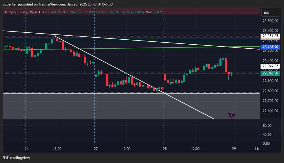 The Nifty managed to close Tuesday’s trading session in the green, gaining 128.10 points or 0.56% from Monday’s close. The market opened at 22,960.45, recorded a day high of 23,137.95, a day low of 22,857.50, and eventually settled at 22,957.25. We had given a buy call on nifty above 22980 with target of 23200 unfortunately nifty after making a day of 23,137.95 at around 2:45 pm tanked nearly correcting up-to 180 points.