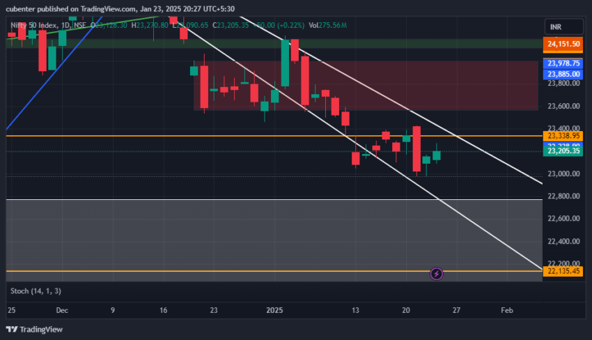 Nifty View for Friday, 24th January 2025: The Indian equity market witnessed a resilient trading session on Thursday, marked by a steady positive momentum. As it was the weekly expiry, the Nifty50 index closed at 23,205.35, gaining +50 points (+0.22%) over the previous day. The index opened on a positive note at 23,228.30, touched an intraday high of 23,270.80, and marked a low of 23,209.65 during the day.