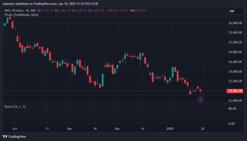 The Indian stock market has seen a roller coaster ride in recent weeks, and Friday’s (17/01/2025) closing of the Nifty Spot index at 23,203.20 (-108.60 points or -0.47%) adds to the cautious sentiment. As we prepare for Monday’s trading session on 22nd January 2025, it is crucial to analyze the potential movement of the Nifty Spot index. Let’s dive into the key support and resistance levels and possible scenarios that may unfold.